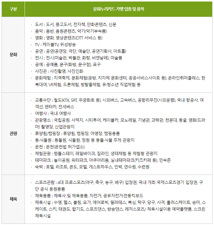 문화누리카드 사용처는 문화, 관광, 체육 분야의 가맹점에서 사용할 수 있습니다.