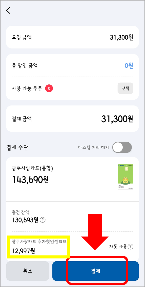 지역화폐를 충전할 때 받은 인센티브가 자동으로 사용되어 최소 7%의 할인 혜택을 받을 수 있습니다.