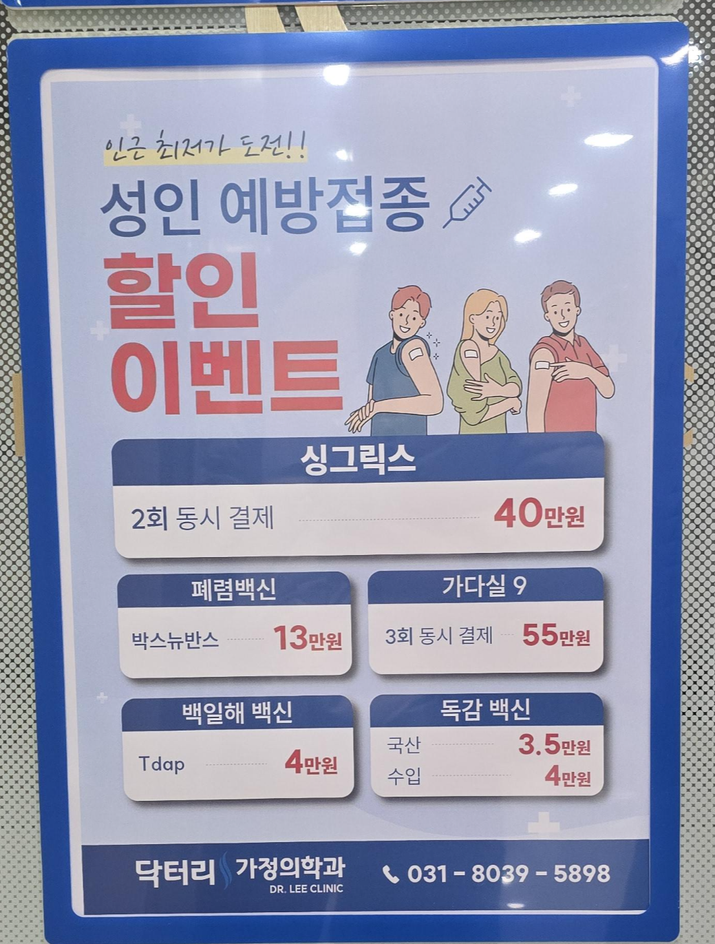 그 외의 독감, 폐렴, 가다실 등의 접종 가격도 비교적 저렴한 편인 것 같습니다.