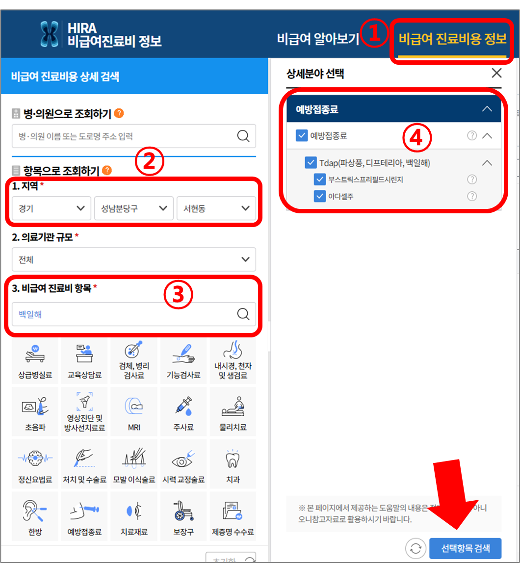 건강보험심사평가원 사이트에서 비급여 진료비용 정보 탭에 들어가서, 거주지역을 선택하고 '백일해'를 검색합니다. 그리고 예방접종료를 선택한 뒤 선택항목 검색을 클릭합니다.