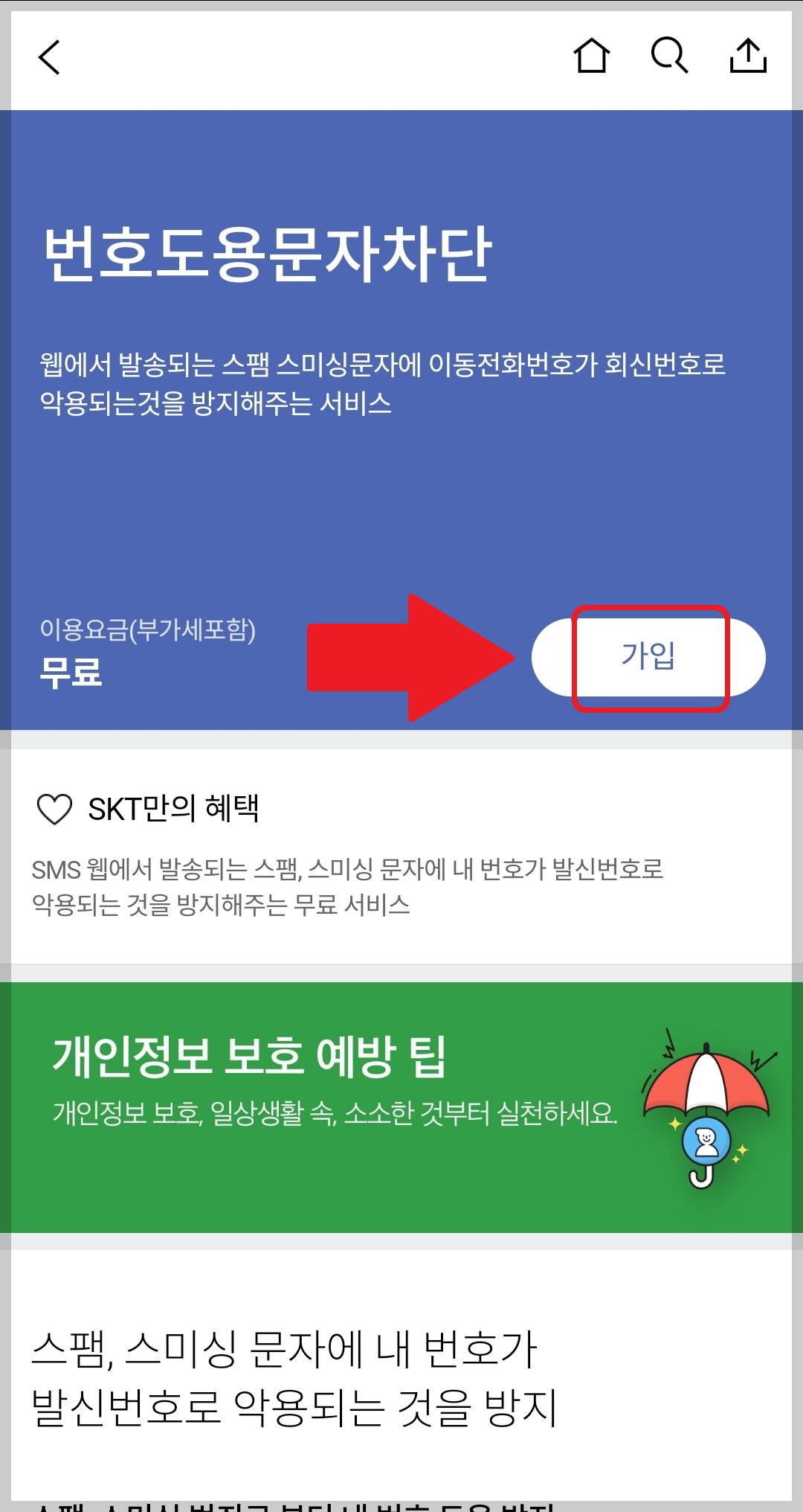 모바일이 아닌 웹에서 발송되는 스팸문자에 본인의 전화번호가 발신번호로 사용되는 것을 방지해 주는 서비스입니다.