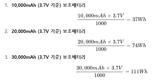 하지만 30,000mAh 이상인 보조배터리는 출력 전압에 따라 100Wh를 초과할 수 있기 때문에 아래와 같이 mAh - Wh 변환을 계산해 보시고 반입 가능 여부를 확인해 보시기 바랍니다.