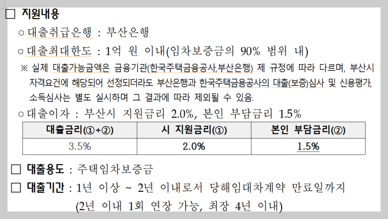 부산 머물자리론은 최대 1억 원 한도에서 연 1.5%의 저금리 대출을 지원합니다. 총 3.5%의 금리 중 부산시가 2.0%를 지원하여 무주택 청년은 1.%의 초저금리로 대출받을 수 있습니다.