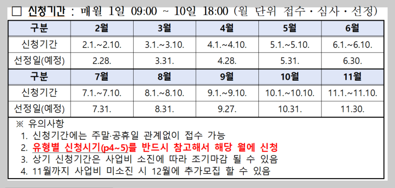 매월 초에 접수하여 월말에 선정되며, 11월까지 사업비가 남으면 12월에 추가모집도 가능합니다.