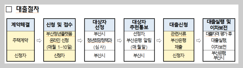 매월 1일 9:00부터 10일 18:00까지 신청 후 월말에 대상자로 선정되면 부산은행에 관련서류를 제출하고 대출신청을 하면 됩니다.