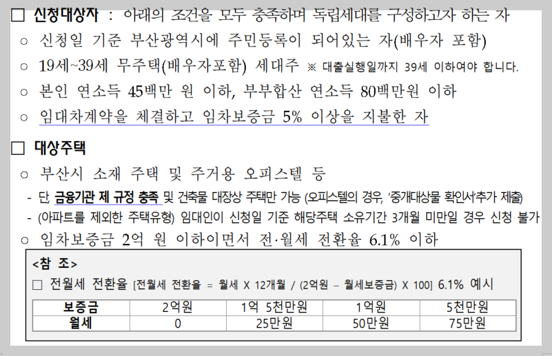 - 대상주택 : 임차보증금 2억 원 이하이면서 전월세전환율 6.1% 이하