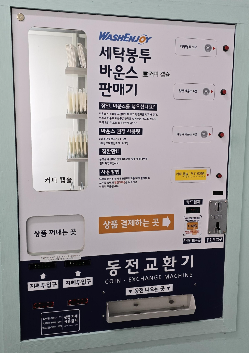 커피, 게임기, 안마기, 아이스크림 등도 있어서 세탁을 기다리는 동안 시간 때우기에 좋았습니다. 캡슐커피는 옆에 있는 자판기에서 캡슐을 구매(1,000원)해서 사용할 수 있습니다.