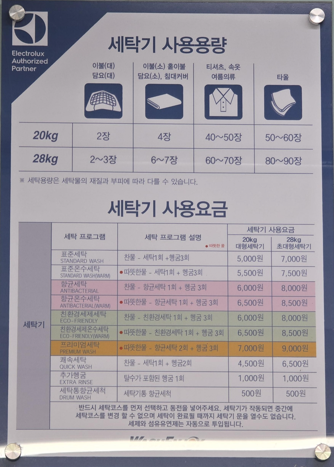 이용요금은 대형 세탁기 기준으로 표준세탁 5,000원부터 시작해서 7,000원까지 있습니다. 초대형 세탁기는 이용요금이 2,000원씩 더 비쌉니다.