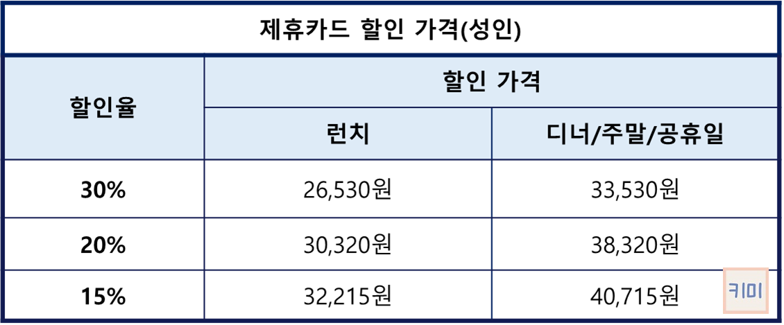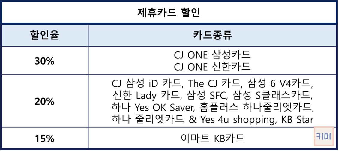 제휴카드로 결제 시 최대 30%까지 할인 혜택을 받을 수 있습니다. 제휴카드는 삼성카드, 신한카드, CJ카드, 하나카드, KB국민카드 등이 있습니다.(제휴카드 확인하기)