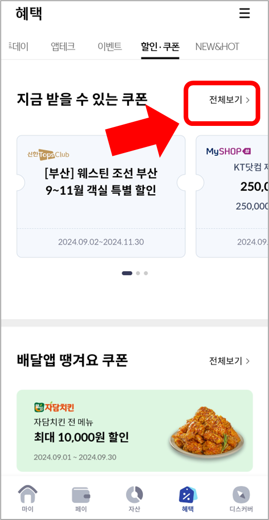 - 지금 받을 수 있는 쿠폰에서 [전체보기]를 선택합니다.