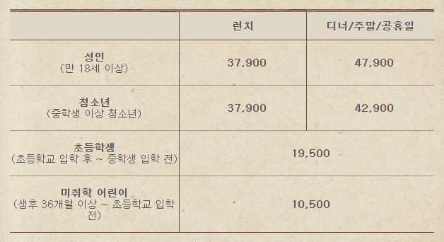 성인 기준으로 런치는 37,900원이고 디너/주말/공휴일은 47,900원이 이용 가능합니다.