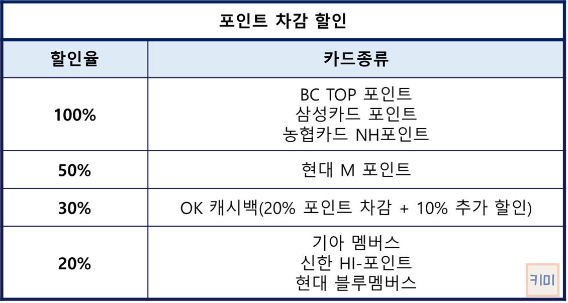 포인트를 쓸 수 있는 카드는 BC TOP 포인트, 삼성카드 포인트, 농협카드 NH포인트, 현대 M 포인트, OK캐시백, 기아멤버스, 신한 HI-포인트, 현대 블루멤버스입니다.
