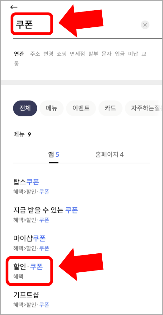 - 신한 쏠페이 앱에서 [쿠폰]을 검색하고 [할인·쿠폰]을 선택합니다.