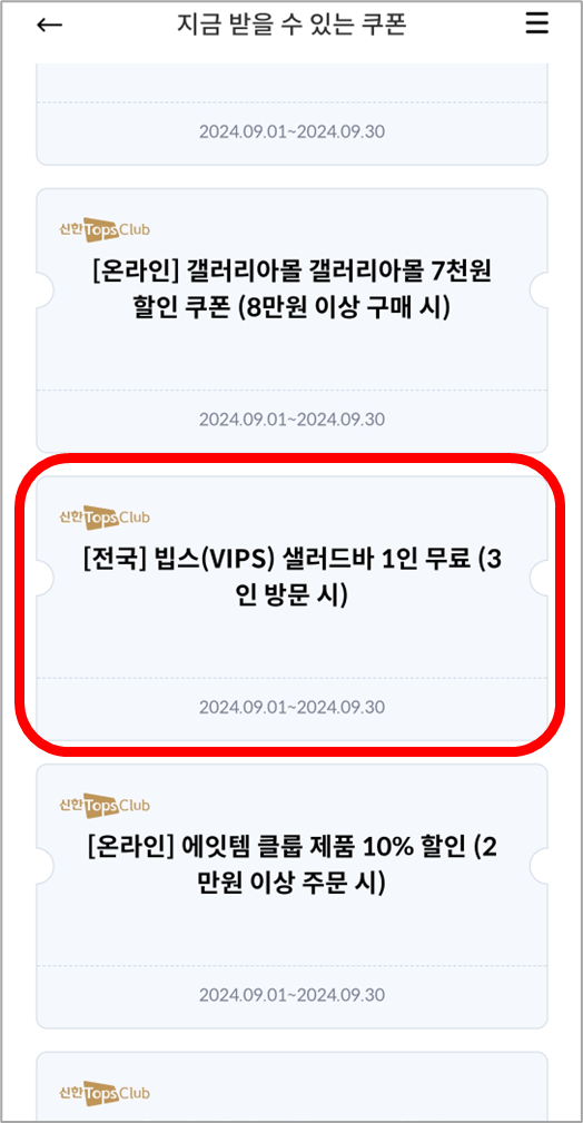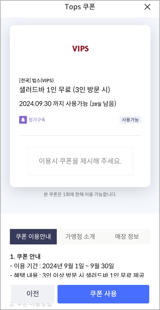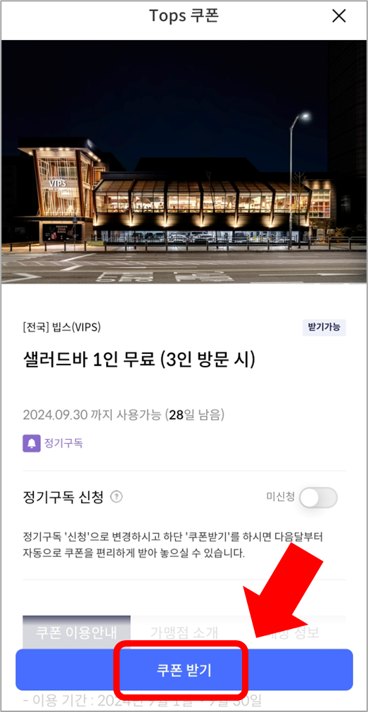 - 스크롤을 아래로 내려서 [빕스(VIPS) 샐러드바 1인 무료] 쿠폰을 선택합니다.