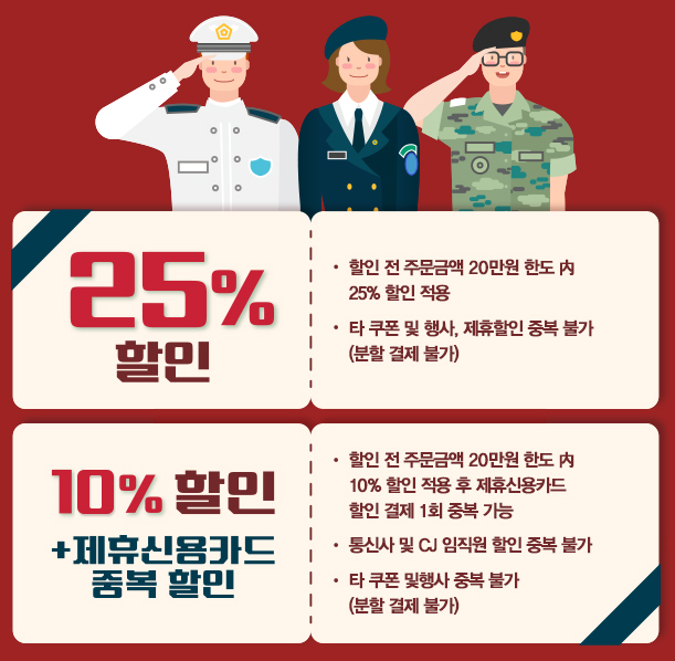 현역병사, 현역간부, 20년 이상 복무한 예비역 간부, 주한미군, 각 군 사관생도, 소방공무원은 25% 할인 혜택을 받을 수 있습니다.