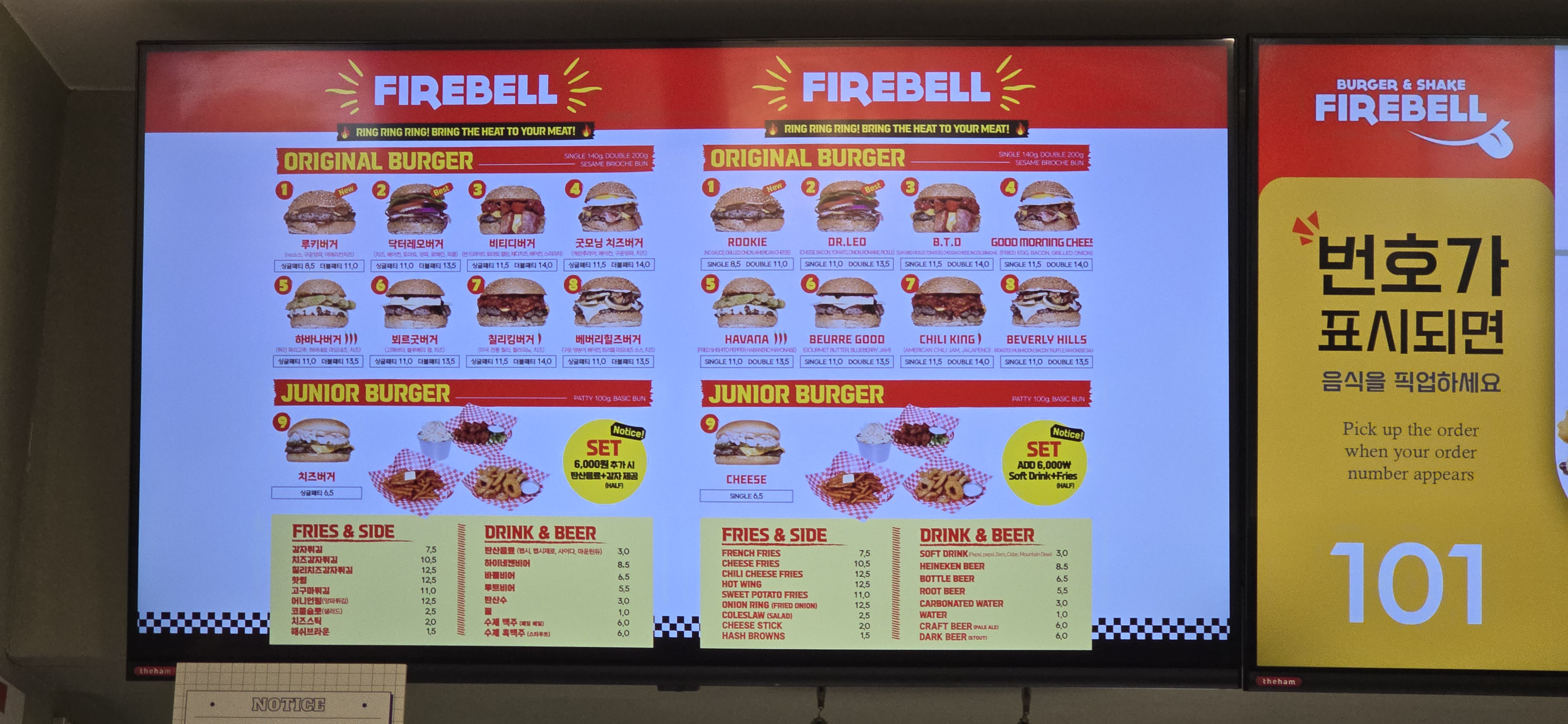 파이어벨은 다양한 종류의 수제 버거와 쉐이크, 프라이즈 메뉴가 준비되어 있습니다.