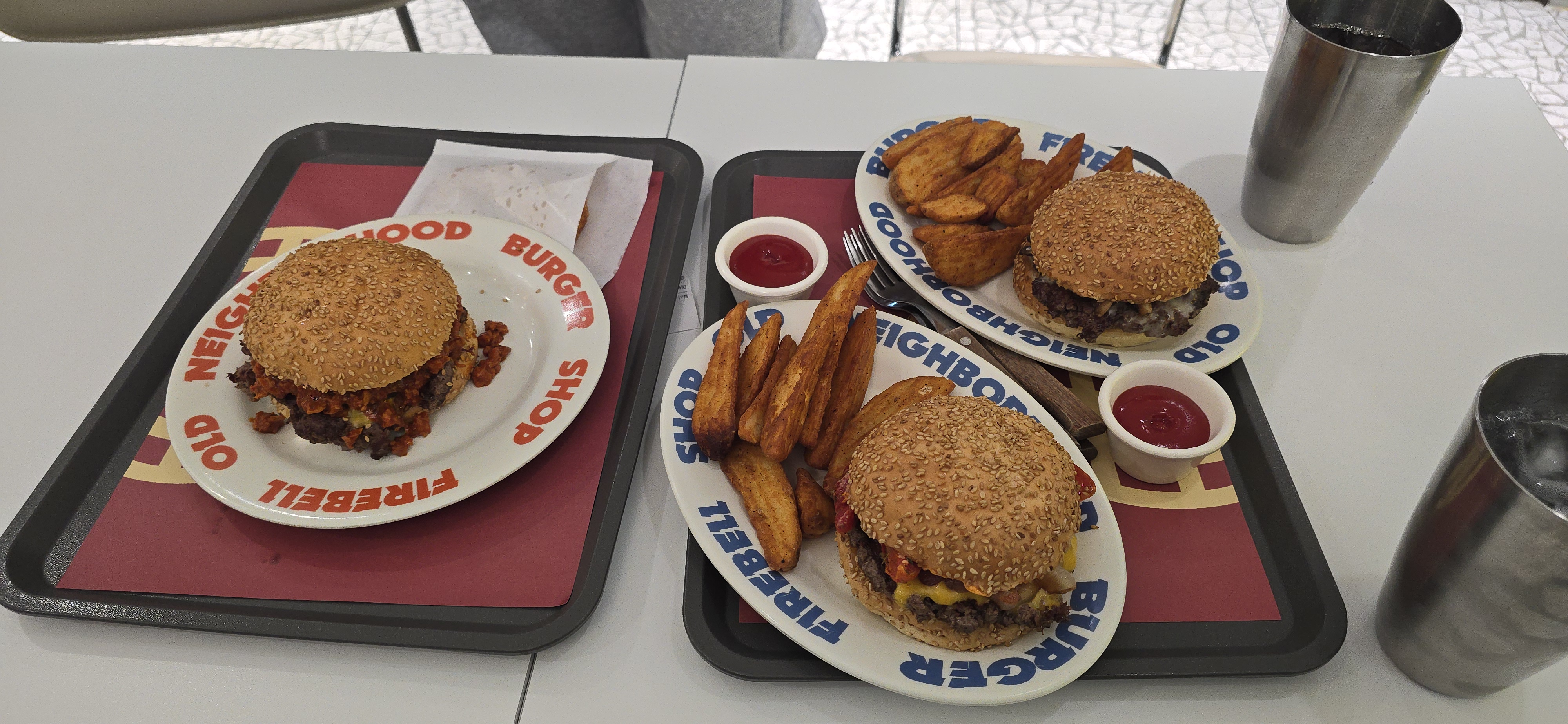일행은 칠리킹버거와 베버리힐즈버거, 그리고 감자튀김을 주문했습니다.