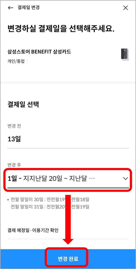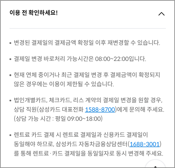 결제일을 한번 변경하면 해당 결제일의 결제금액 확정일이 지난 후에 재변경할 수 있으니 변경 전에 꼭 확인하시기 바랍니다.