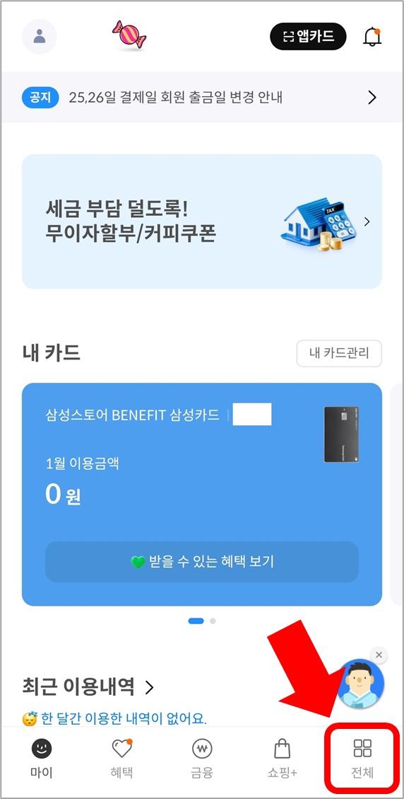 먼저, 삼성카드 앱에 로그인하고 오른쪽 아래에 있는 [전체메뉴]로 들어가서