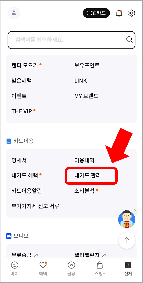 화면을 아래로 내리면 [내카드 관리]가 있습니다.
