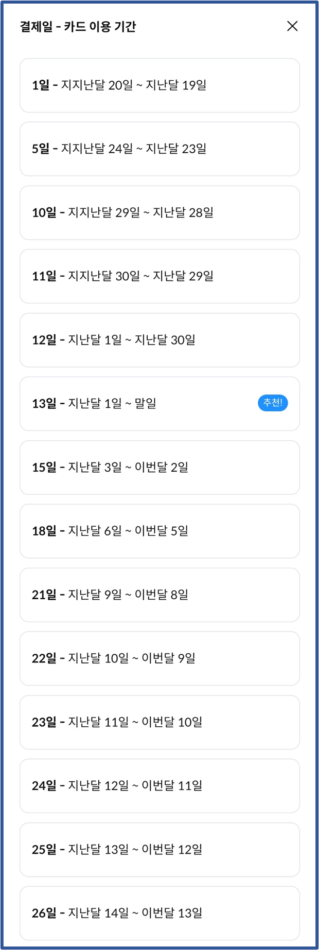 • 25일 : 지난달 13일 ~ 이번달 12일