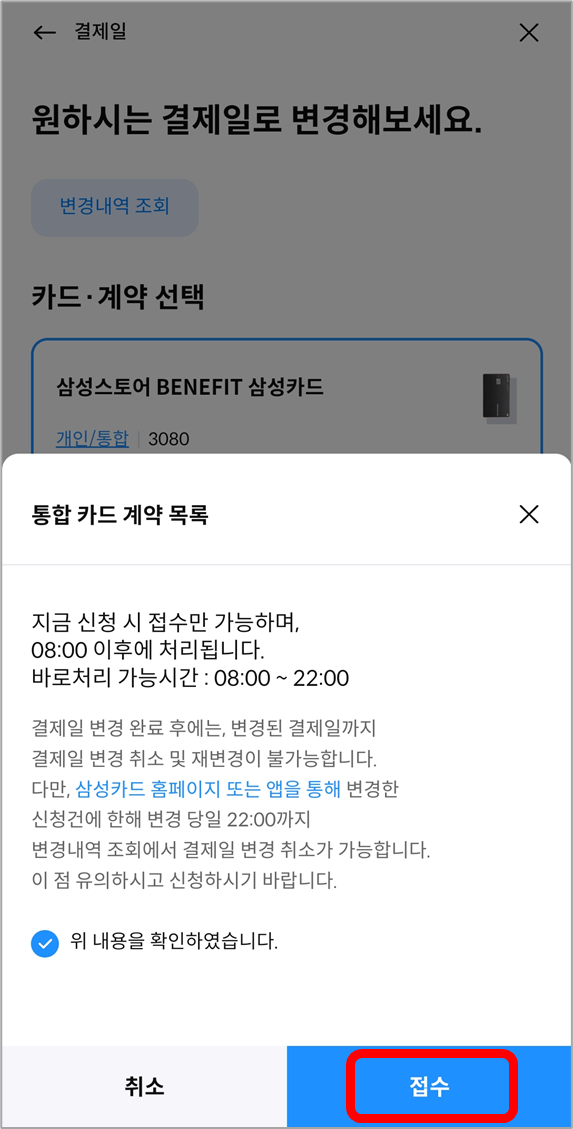 안내창에서 [접수]를 누르고 변경할 결제일을 선택하면