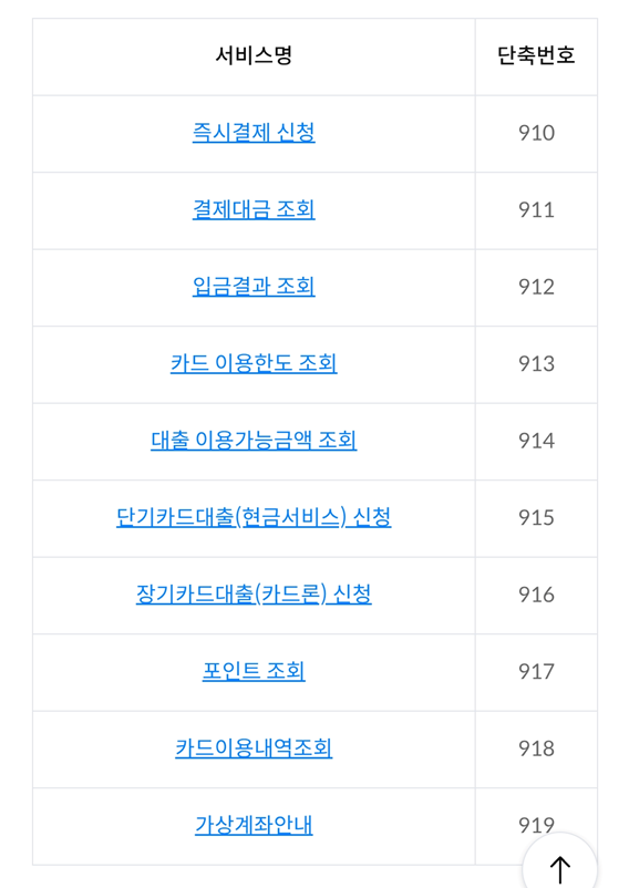 즉시결제 신청, 결제대금 조회, 입금결과 조회, 카드 이용한도 조회, 대출 이용가능금액 조회, 카드대출 신청, 포인트 조회, 카드이용내역조회, 가상계좌안내 등의 서비스는 아래의 단축번호를 눌러서 빠르게 해결할 수 있습니다.