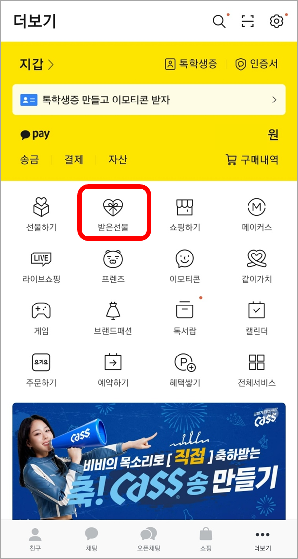 먼저, 카카오톡에서 기프티콘을 조회해야 합니다. 카카오톡 받은선물로 들어가서, 삼성페이에 등록하고 싶은 기프티콘을 선택합니다.