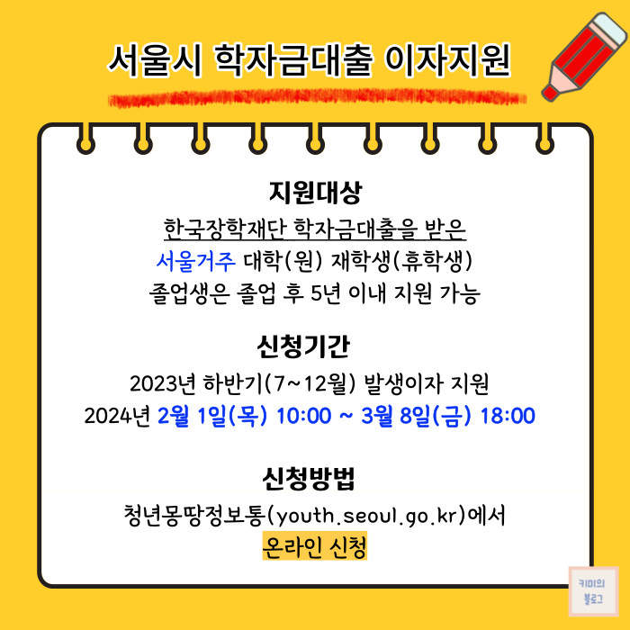 이번 포스팅에서는 서울시 학자금대출 이자지원 신청기간 및 신청방법에 대해 알아보겠습니다.