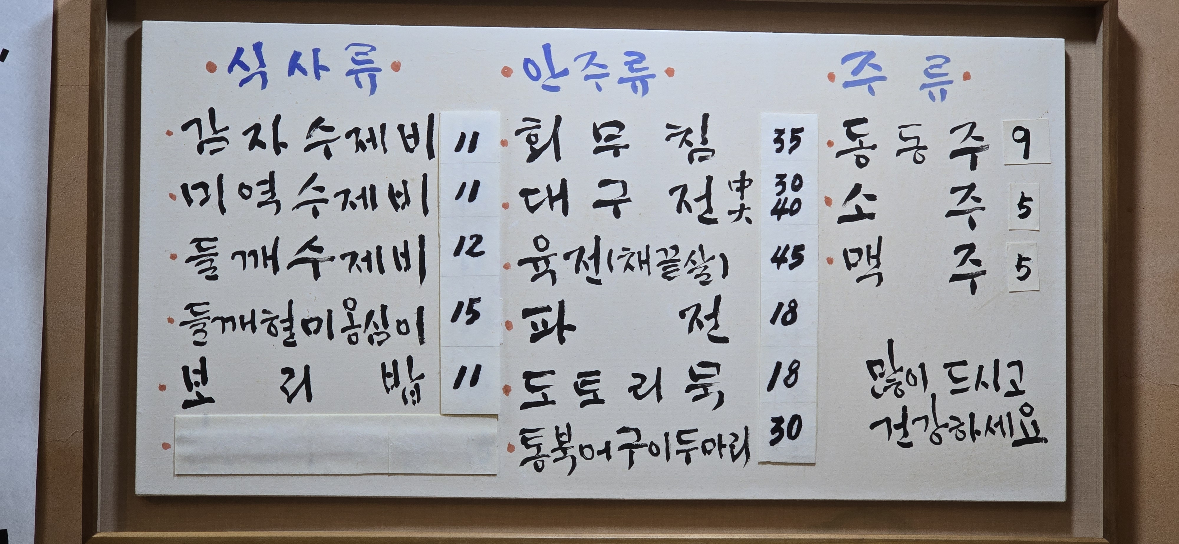 그 외에 회무침, 대구전, 육전, 파전, 도토리묵, 북어구이와 같은 안주류가 꽤 다양하게 있습니다.