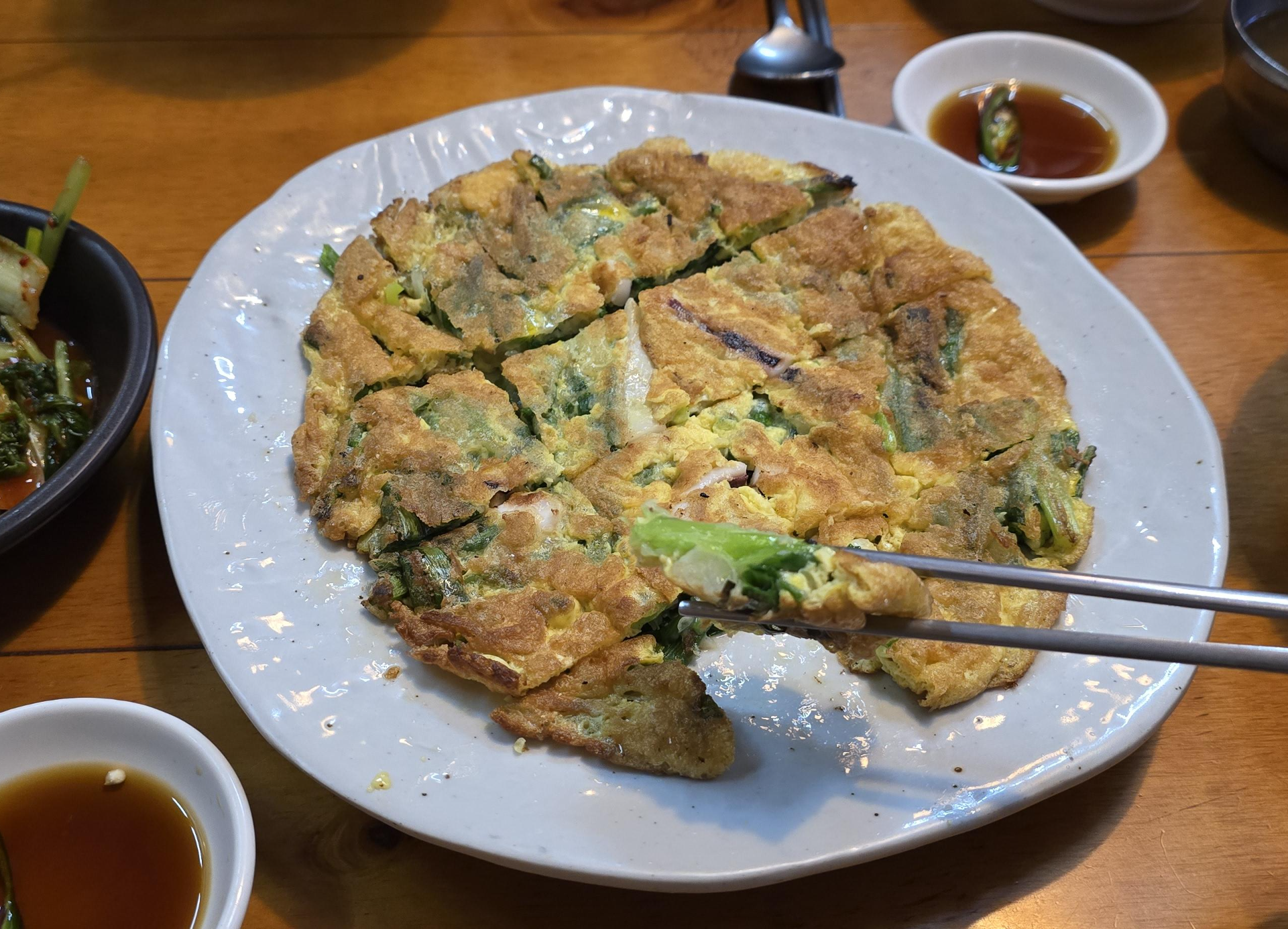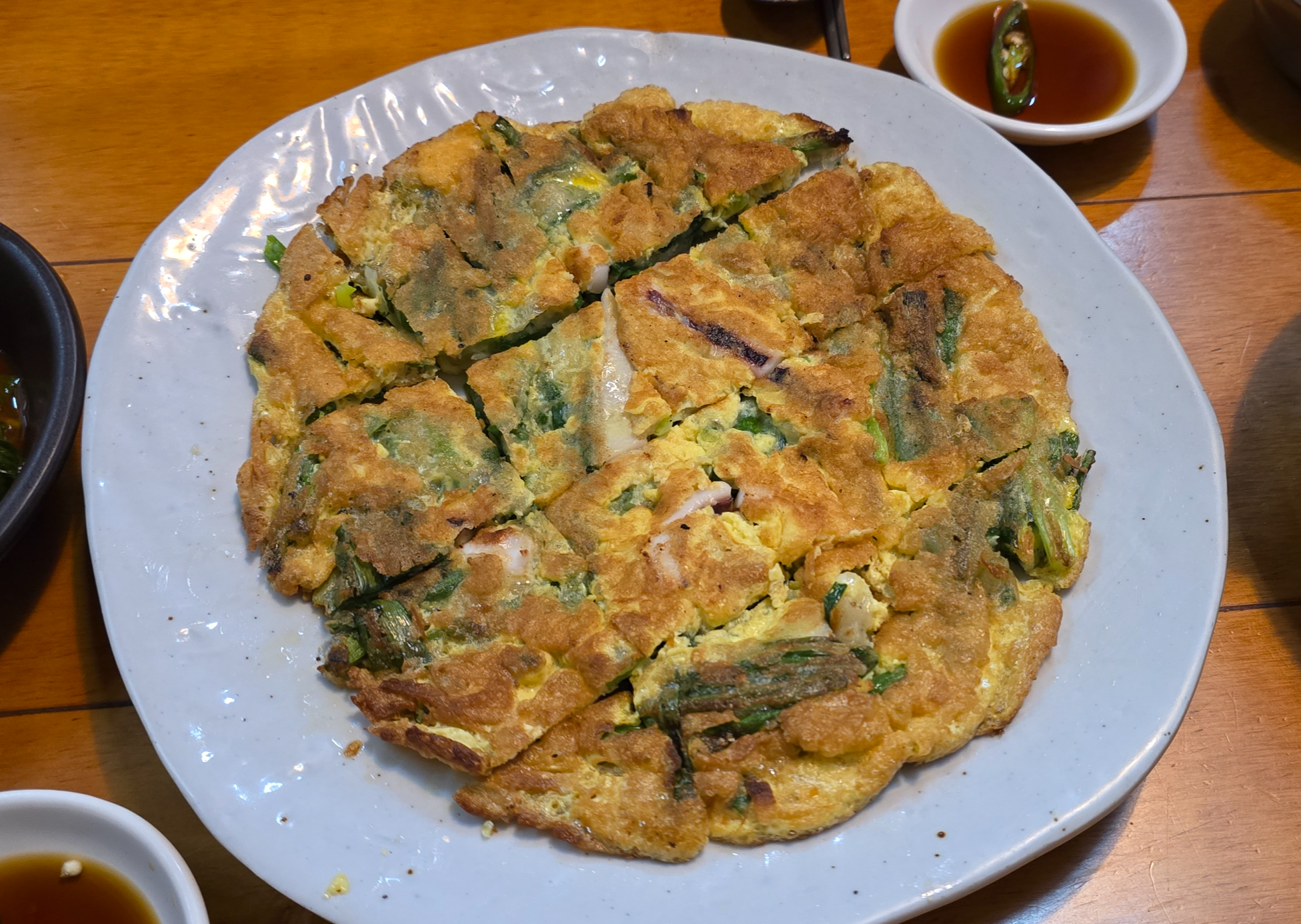 파가 듬뿍 들어 있고, 고소하면서도 적당히 아삭한 식감이 살아 있는 맛있는 파전이었습니다. 파전에도 고추절임을 한 두 조각씩 올려먹으면 더 맛있습니다.