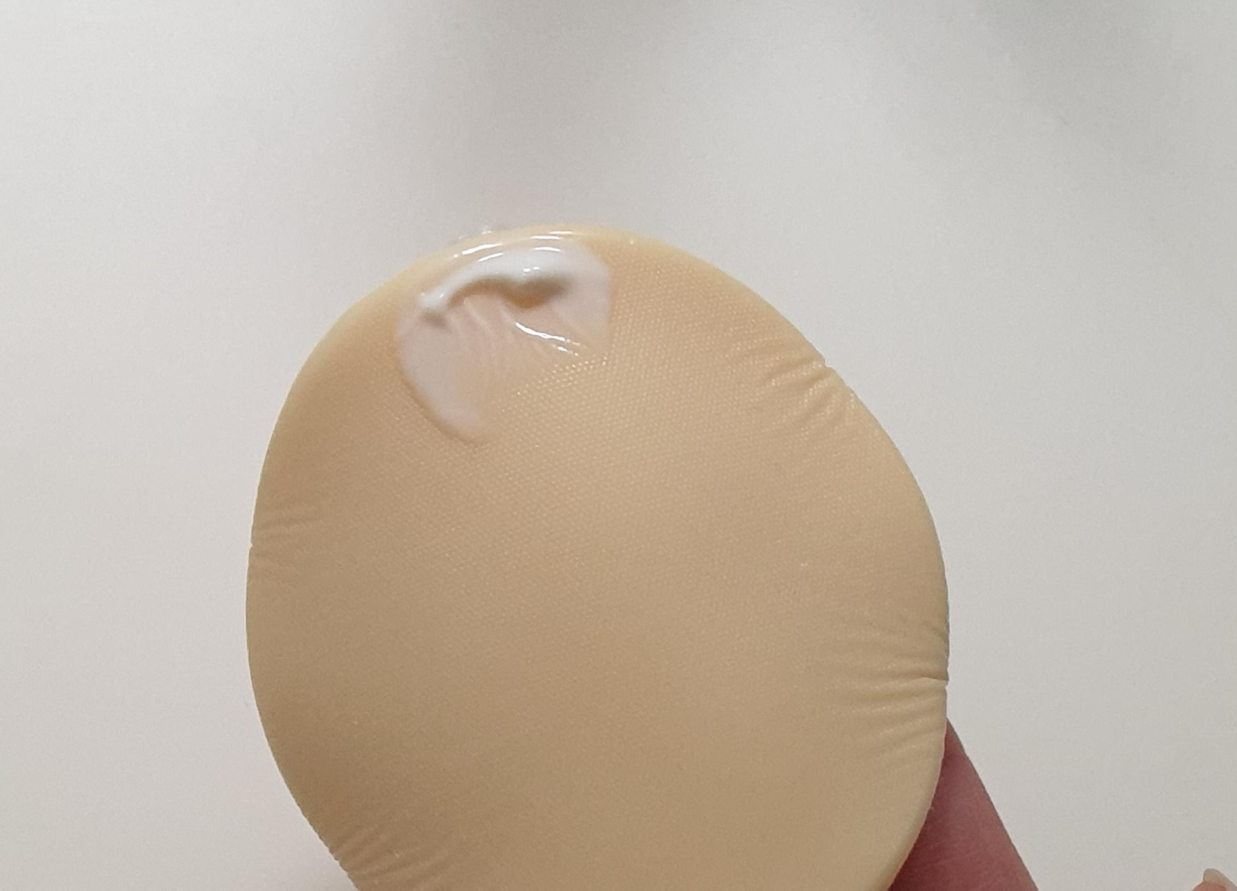 그냥 제가 평소에 사용하는 모습을 그대로 찍어 봤습니다. 손으로 막 챱챱 바르듯이 퍼프를 사용할 때도 마찬가지입니다. 실리콘 퍼프가 쫀쫀하게 달라붙는 촉감이 있어서 손으로 바를 때랑 마찬가지로 막 펴 바르거나 두드려도 뭉치는 곳 없이 잘 발립니다. 저는 선크림을 바를 때만 사용하는 편이지만 로션이나 파운데이션을 바를 때 사용해도 좋을 것 같습니다.