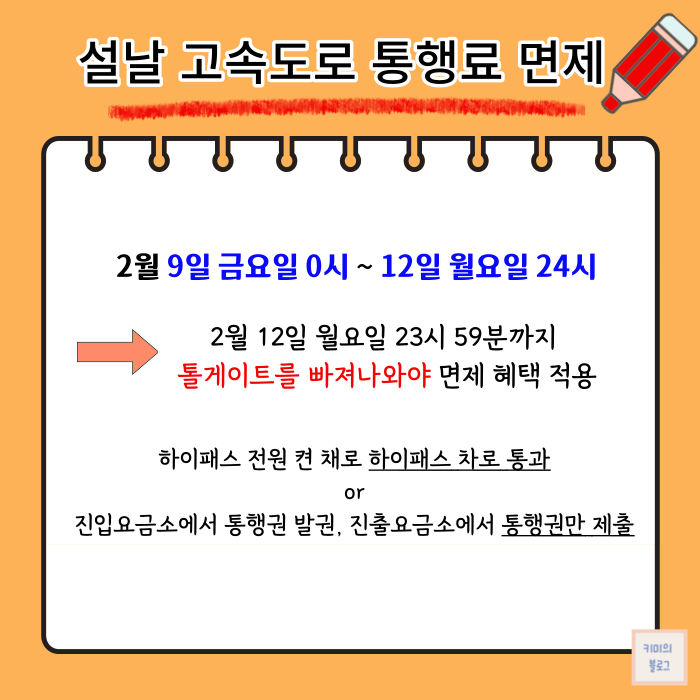 - 통행료 면제 기간 : 2월 9일 금요일 ~ 2월 12일 월요일