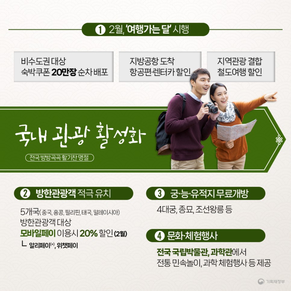정부는 2월을 '여행가는 달'로 지정하고 국내 숙박쿠폰 20만장을 배포한다고 합니다. 비수도권 숙박업소에서 5만원 초과 예약 시 3만원 할인 혜택을 제공합니다.