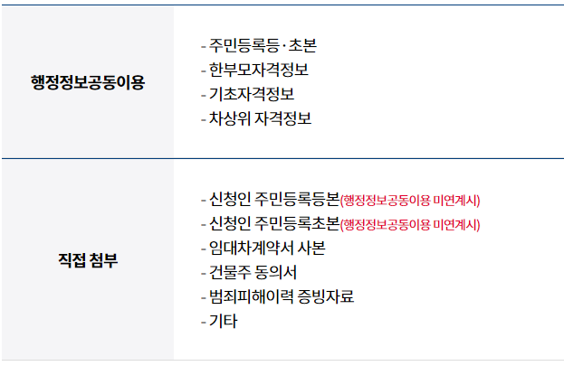 그 외에 한부모자격정보, 기초자격정보, 차상위 자격정보, 임대차계약서 사본, 건물주 동의서, 범죄피해이력 증빙자료 등이 필요합니다.