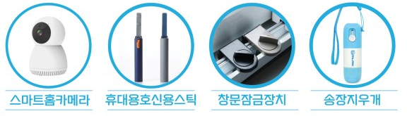 창문 잠금장치, 송장 지우개, 스마트 문열림센서, 호신용 스틱, 호신용 스프레이 등 다양한 구성의 물품을 지원합니다. 개별 품목구성은 지자체별로 다릅니다.