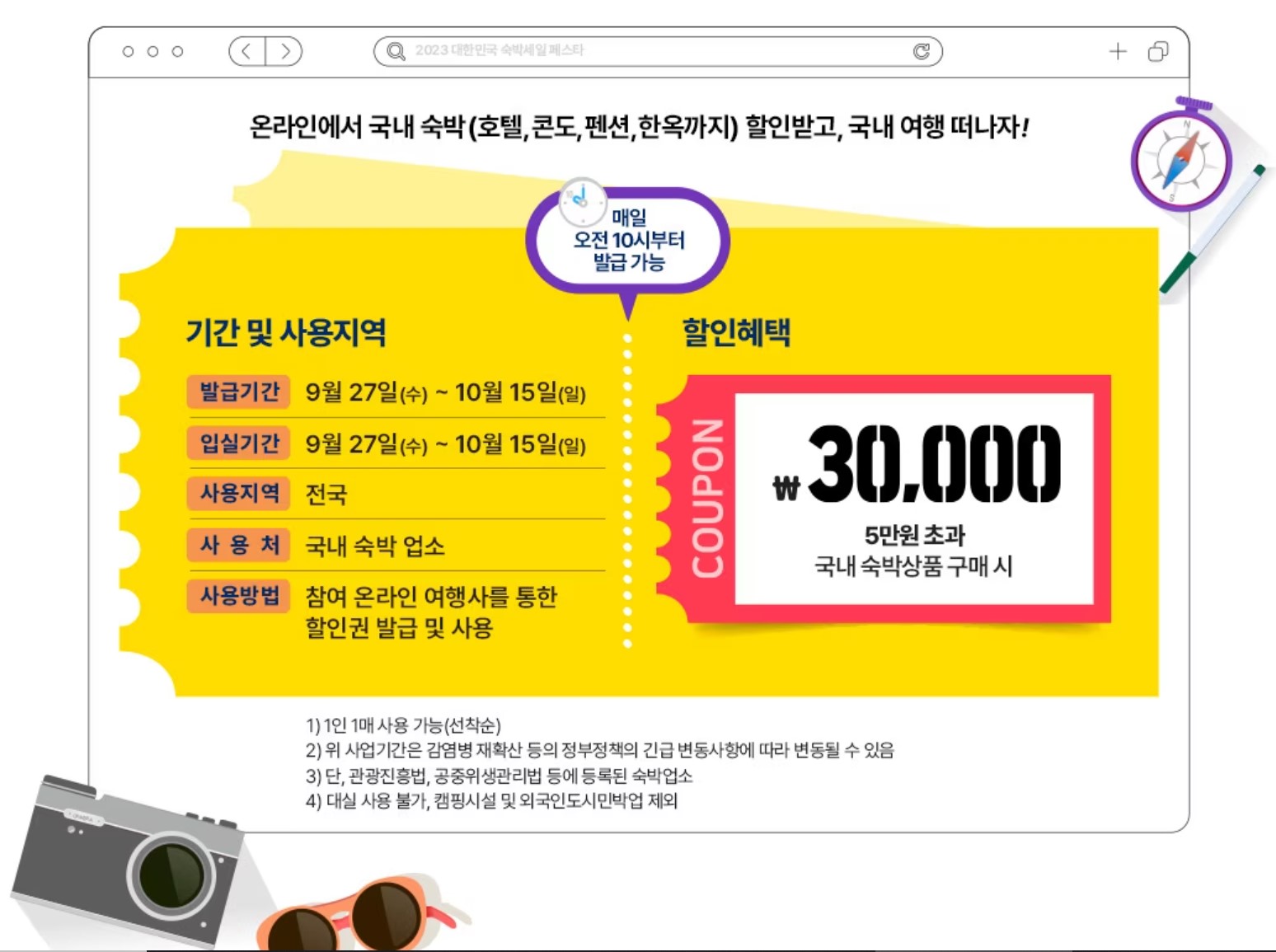 9, 10, 11월 특정 기간에 매일 오전 10시 선착순으로 3만원 할인권을 발급하며, 전국에 있는 숙박 업소 대부분에서 사용할 수 있습니다.