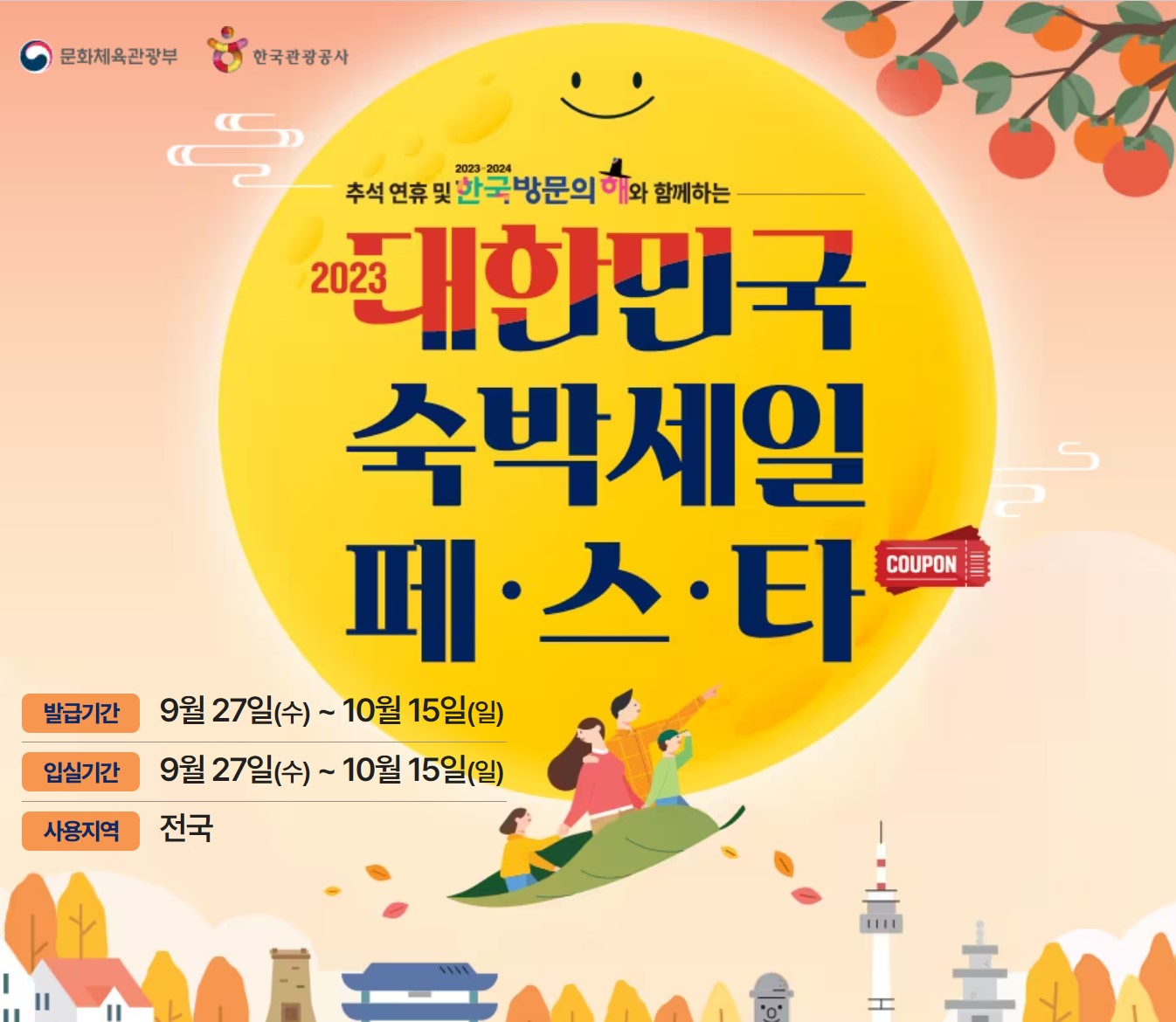 이번 추석에는 9월 28일부터 10월 3일까지 긴 연휴가 이어집니다. 그래서인지 이번 추석에는 해외고, 국내로 여행을 떠나는 분들이 많은데요. 국민들의 숙박비 부담을 덜어주기 위해 문화체육관광부와 한국관광공사에서 2023 대한민국 숙박 세일 페스타를 진행합니다.