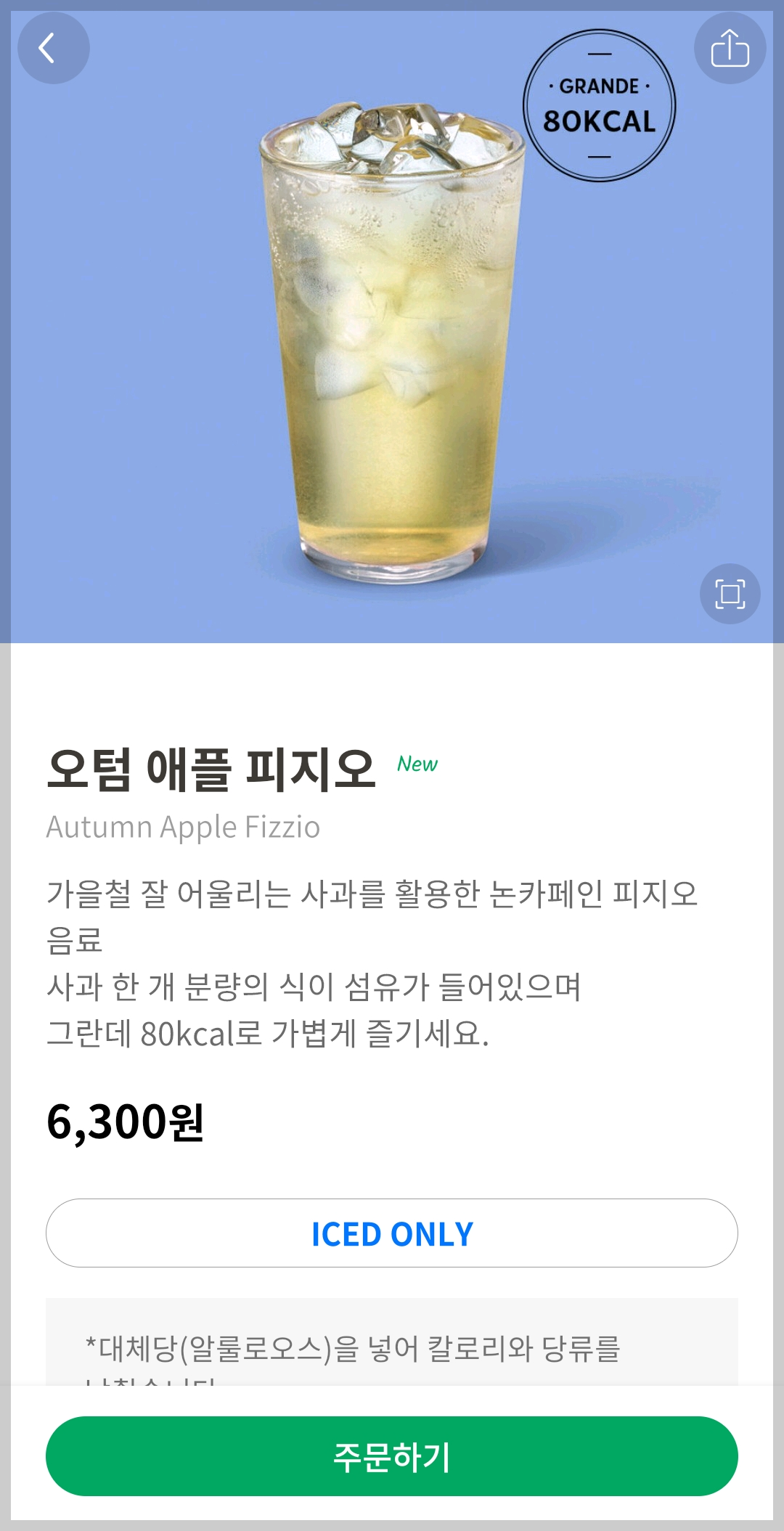 그란데 기준으로도 80kcal 밖에 안 하고, 사과 한 개 분량의 식이 섬유가 들어있다고 합니다.