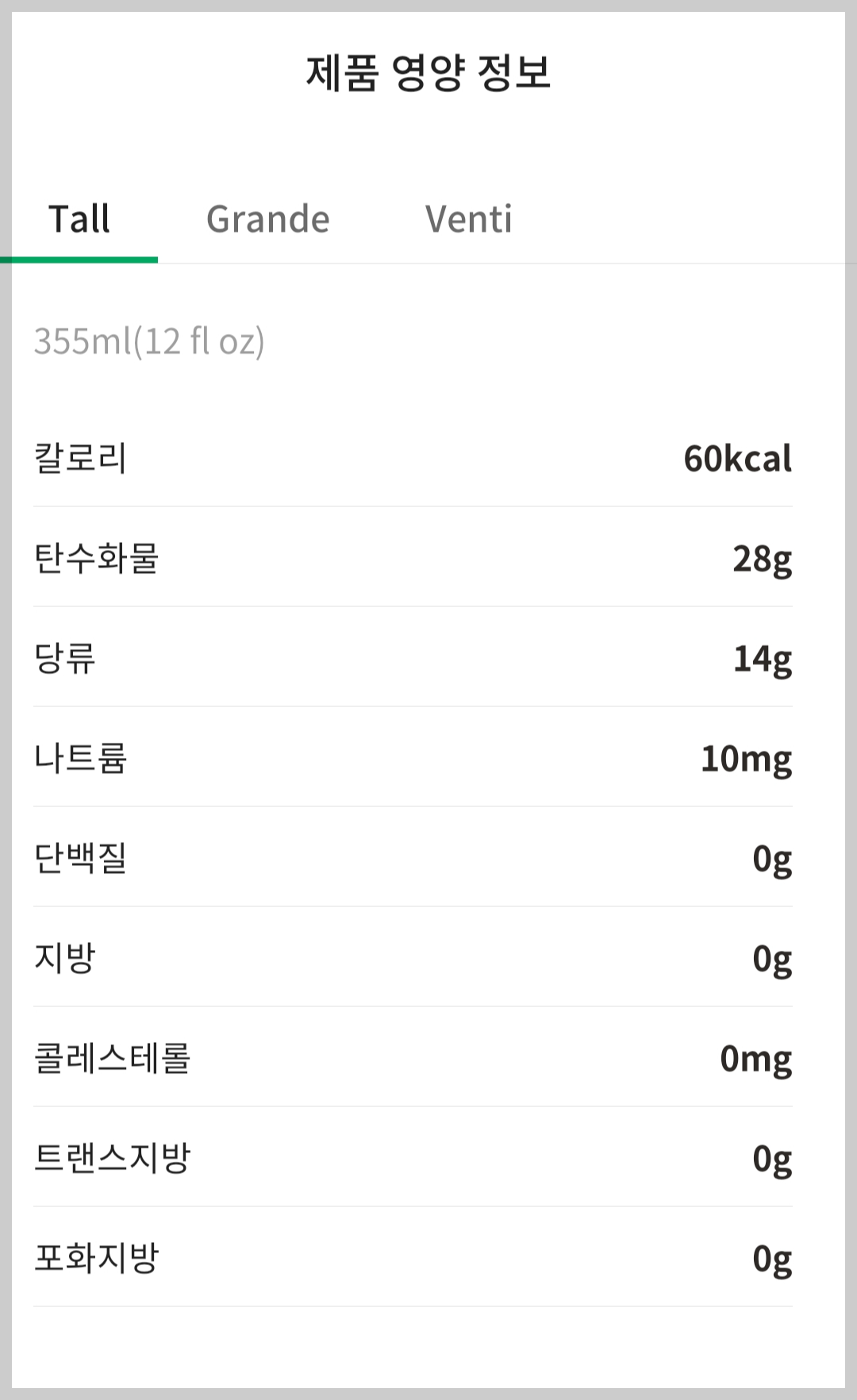 칼로리는 톨 사이즈 기준 60kcal로 굉장히 낮은 편입니다. 대체당(알룰로오스)을 넣어서 칼로리를 낮췄다고 합니다.