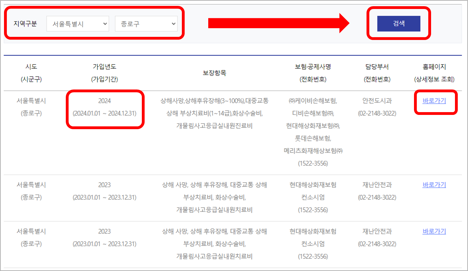 본인이 거주하는 지역을 선택한 뒤 검색하면 해당 지자체에서 시민안전보험에 가입한 내역이 조회됩니다.