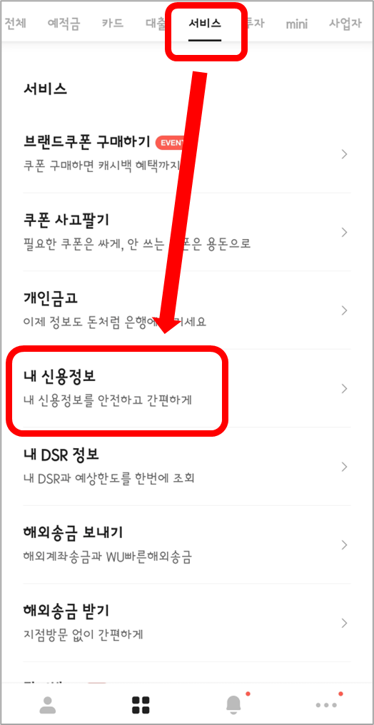 메뉴에서 [서비스 → 내 신용정보]를 선택합니다.