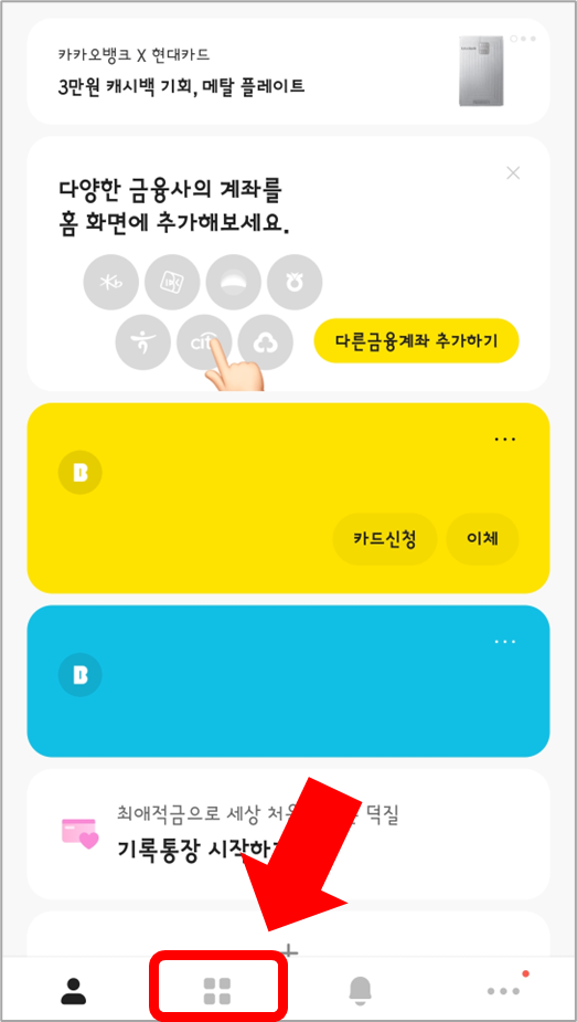 카카오뱅크 메인 화면에서 하단에 있는 메뉴 버튼을 선택합니다.