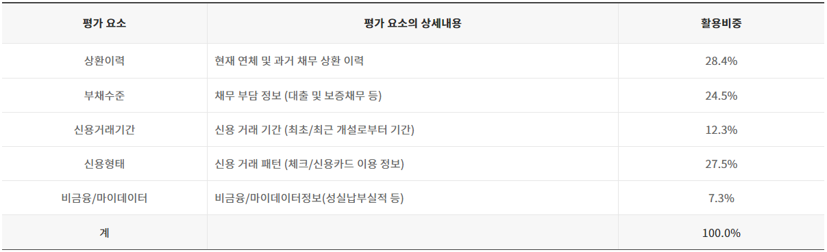 일반적으로는 신용거래형태, 부채수준, 상환이력, 신용거래기간, 비금융/마이데이터 순으로 신용이 평가됩니다.