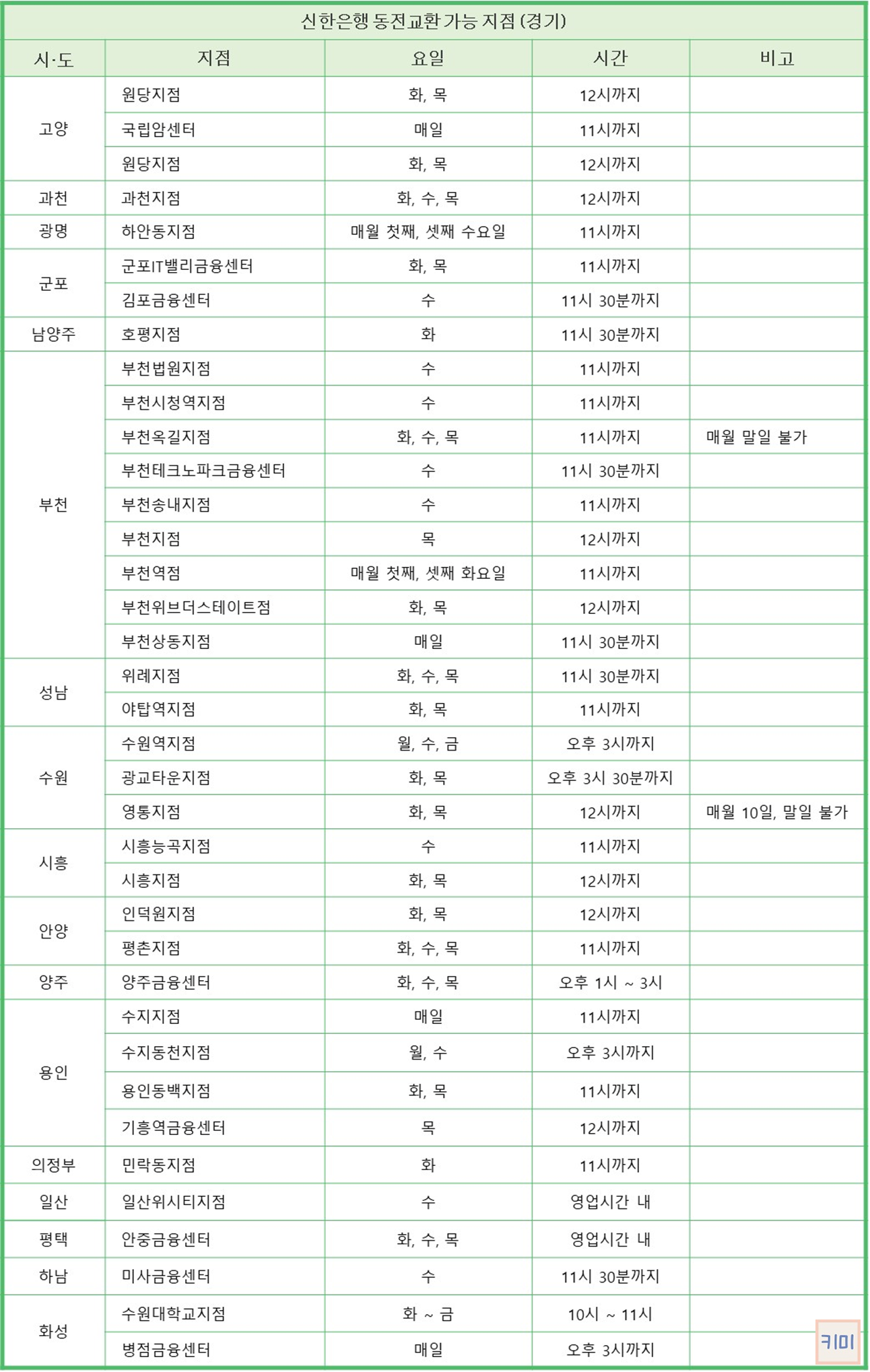 서울, 인천, 경기 지역을 중심으로 동전교환이 가능한 신한은행 지점과 업무 시간을 정리해 보았습니다.