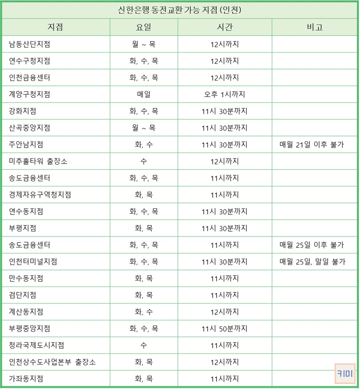 서울, 인천, 경기 지역을 중심으로 동전교환이 가능한 신한은행 지점과 업무 시간을 정리해 보았습니다.