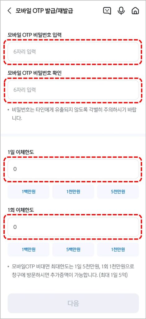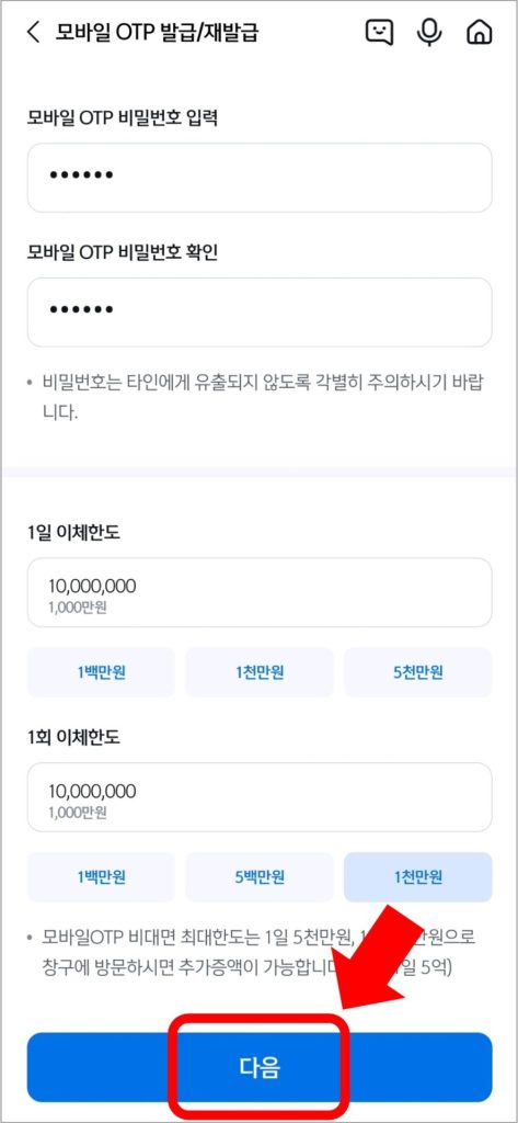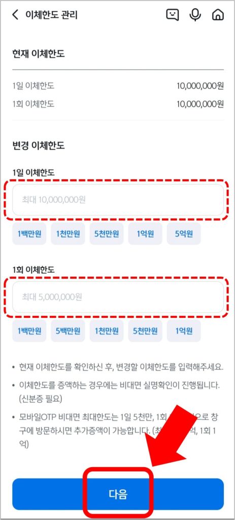 그리고 늘리고 싶은 이체한도 금액을 입력하고 [다음]을 선택합니다.