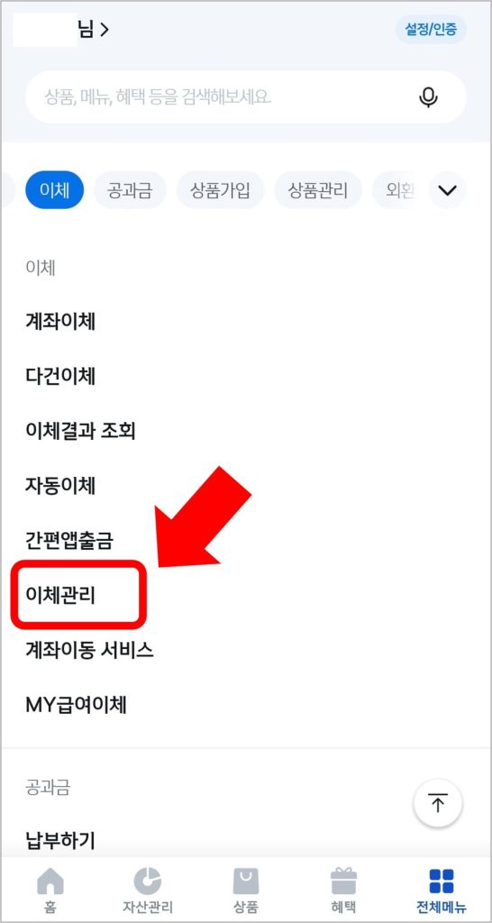 메인화면 오른쪽 밑에 있는 [전체메뉴]를 선택하고, 화면을 아래로 내려서 [이체관리]를 선택합니다.