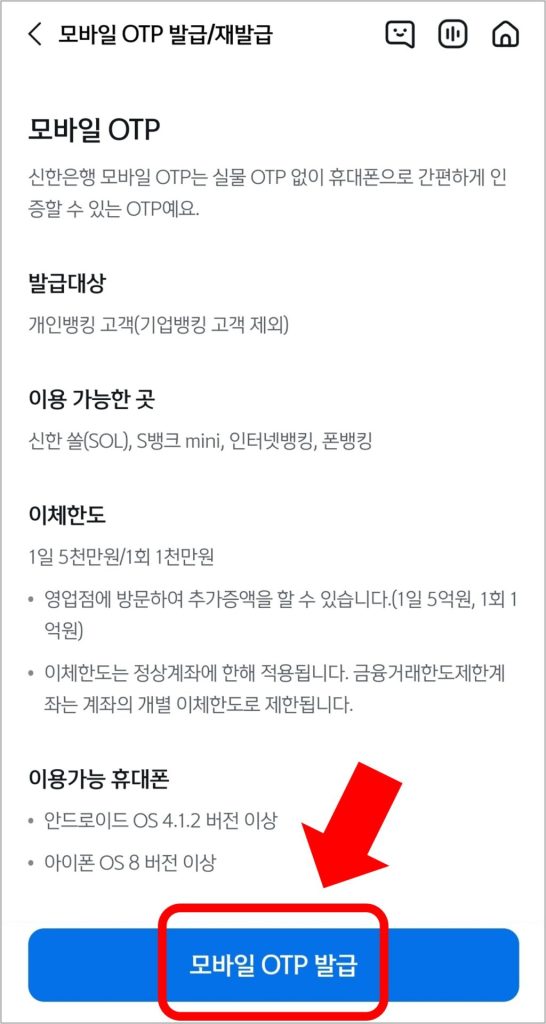 모바일 OTP를 발급받으면 은행에 가지 않고도 하루 최대 5천만원까지 이체가 가능합니다.