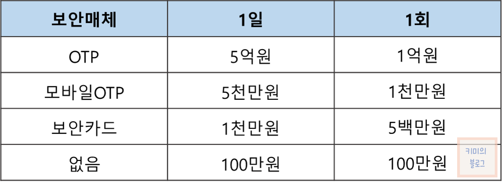 이체한도를 최대로 높이고 싶다면 모바일 TOP를 발급 받으면 됩니다.
